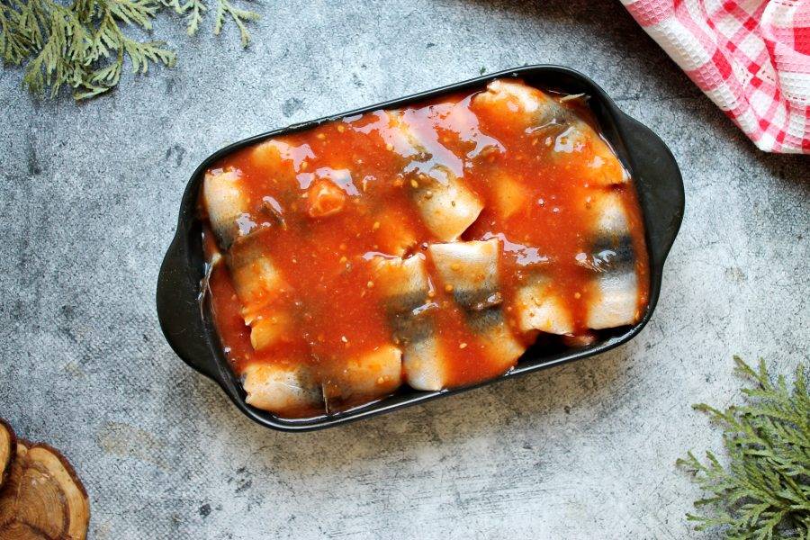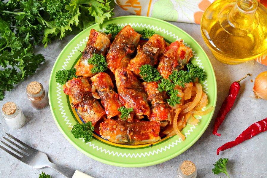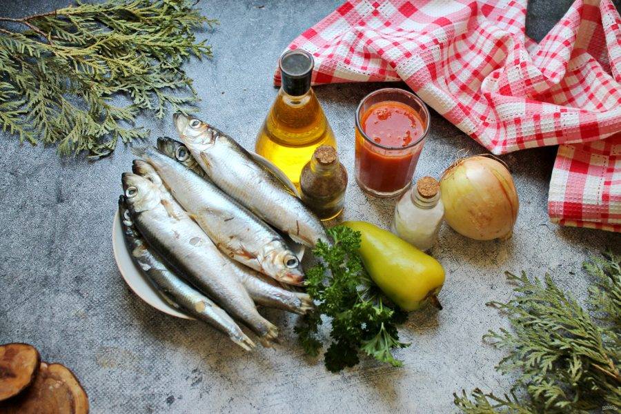 Подготовьте все необходимые ингредиенты для приготовления салаки в томате.