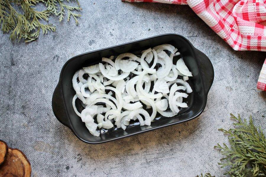 Форму для запекания смажьте растительным маслом и выложите репчатый лук, порезанный полукольцами.