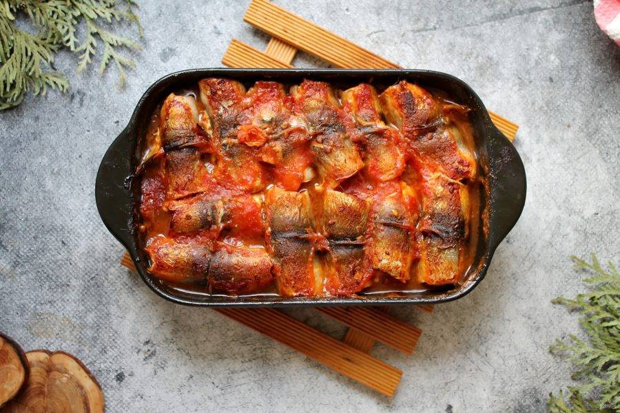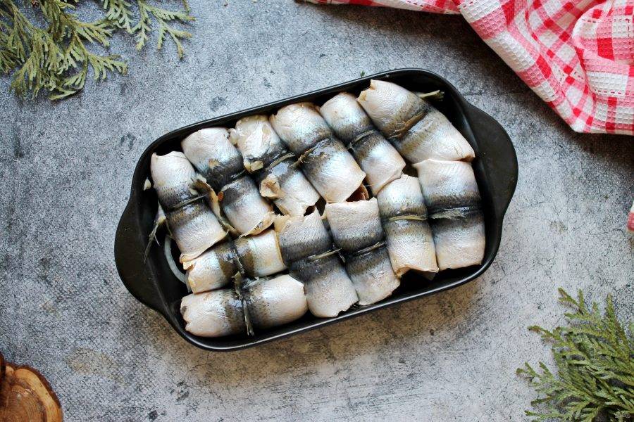 Выложите плотно все рулетики из салаки в форму на репчатый лук.