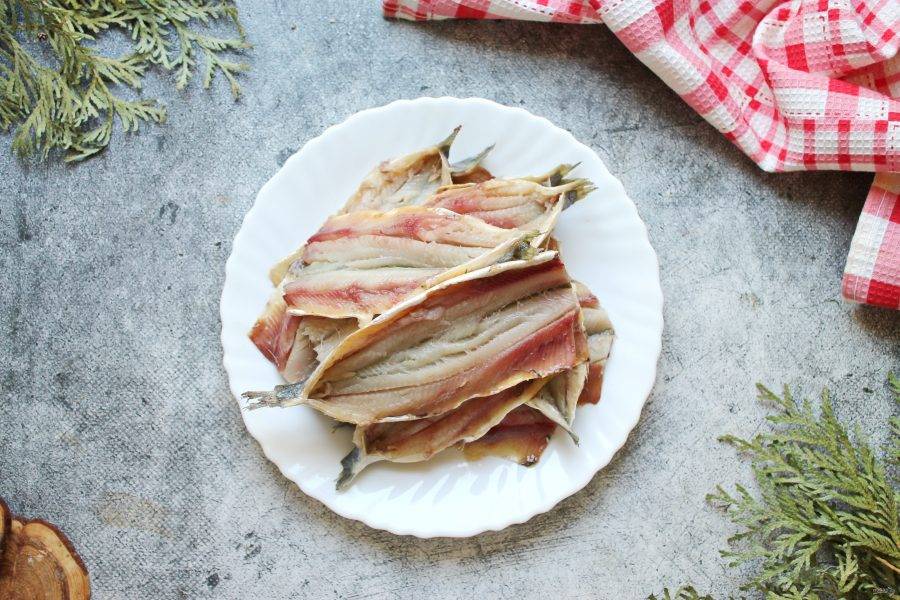 Салаку вымойте, удалите голову, внутренности и черную пленку. Аккуратно удалите центральную кость и мелкие косточки.