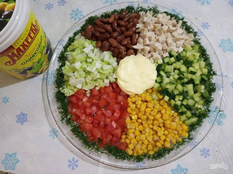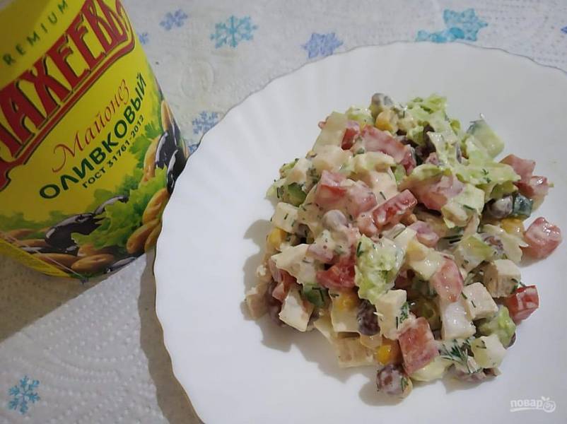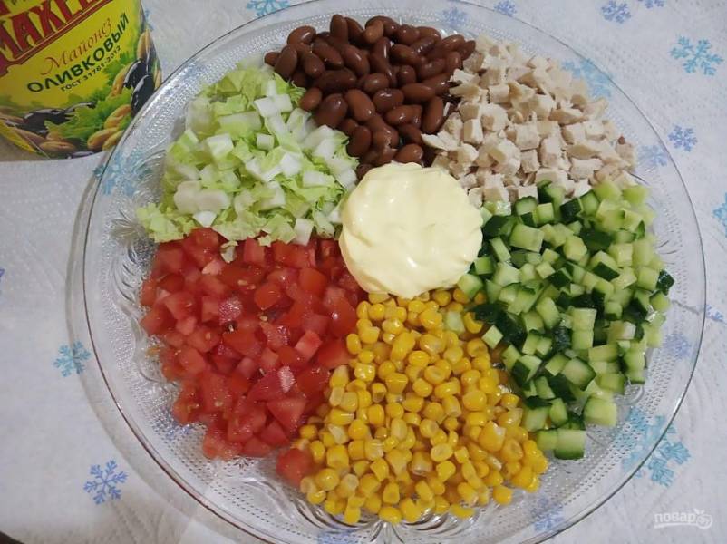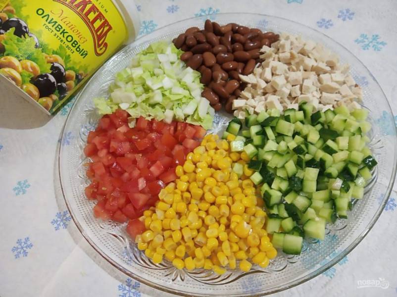 Отварную куриную грудку порежьте на маленькие кубики. Консервированные овощи промойте. Капусту, помидор и огурец порежьте на небольшие кубики.