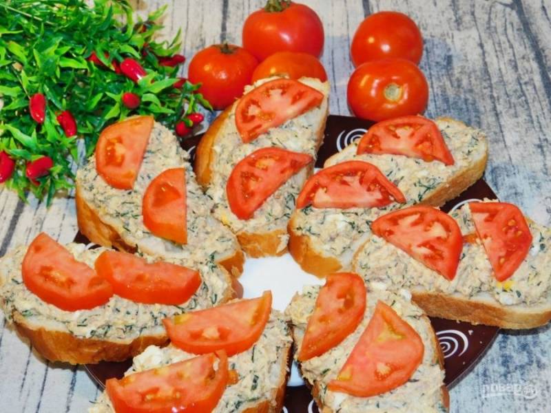 Сверху украсьте нарезанными помидорами, выложите бутерброды на тарелку и подавайте к столу. Приятного аппетита!