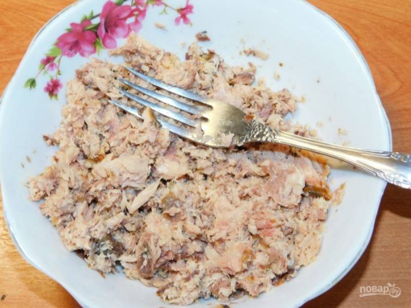 Откройте банку с тунцом, слейте жидкость и разомните мякоть вилкой.