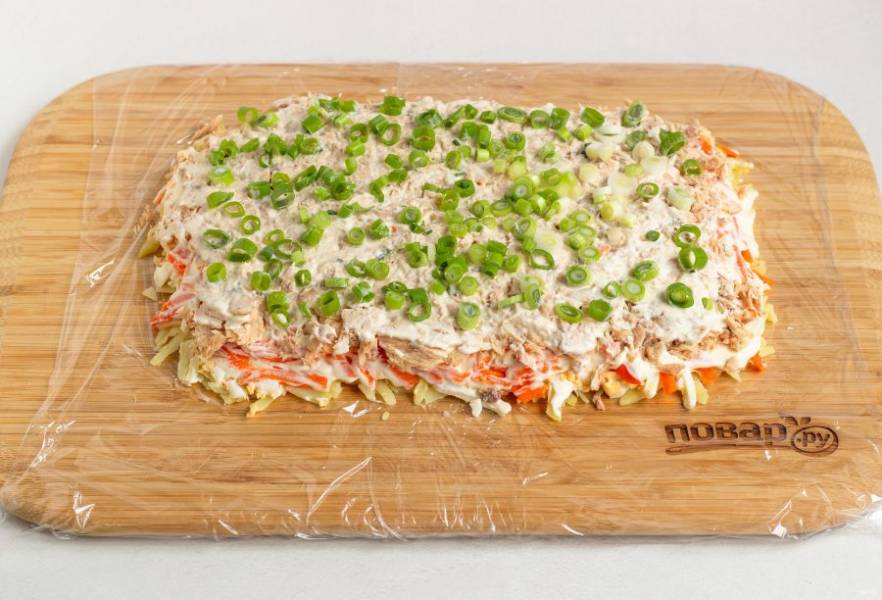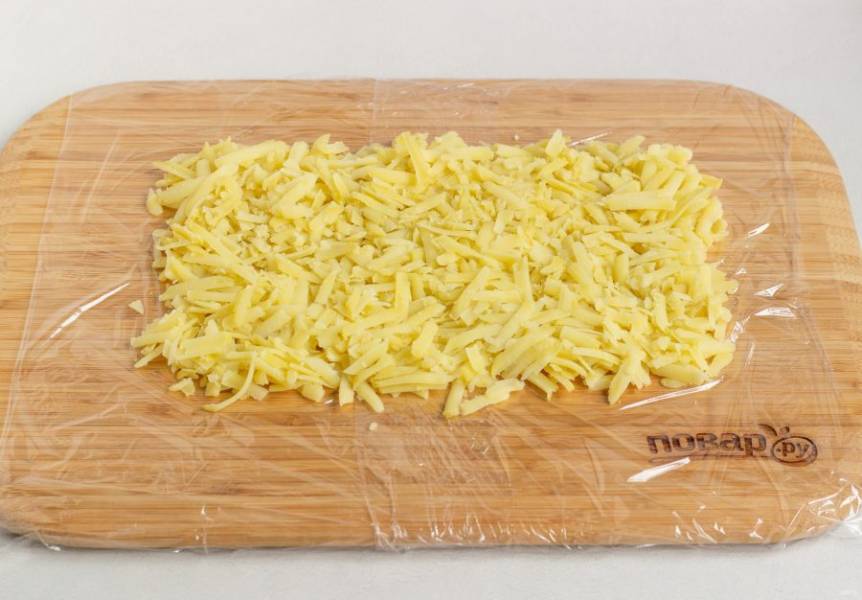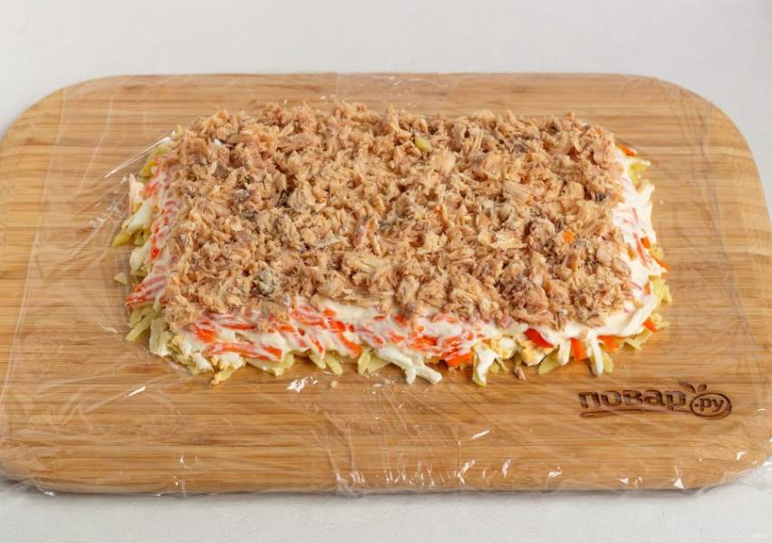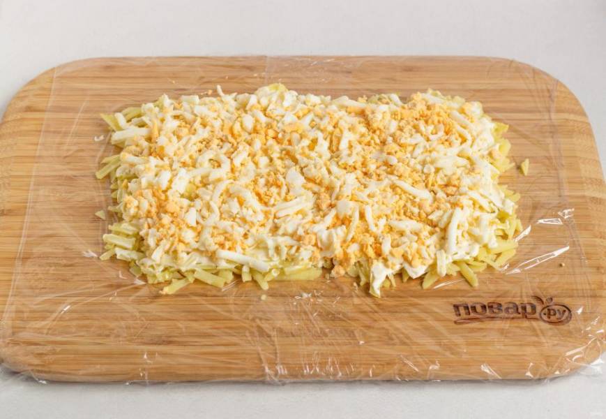 Досочку застелите пищевой пленкой, на нее будем выкладывать салат в виде прямоугольника. 1 слой: вареный картофель натертый на крупной (можно мелкой) терке и майонез.