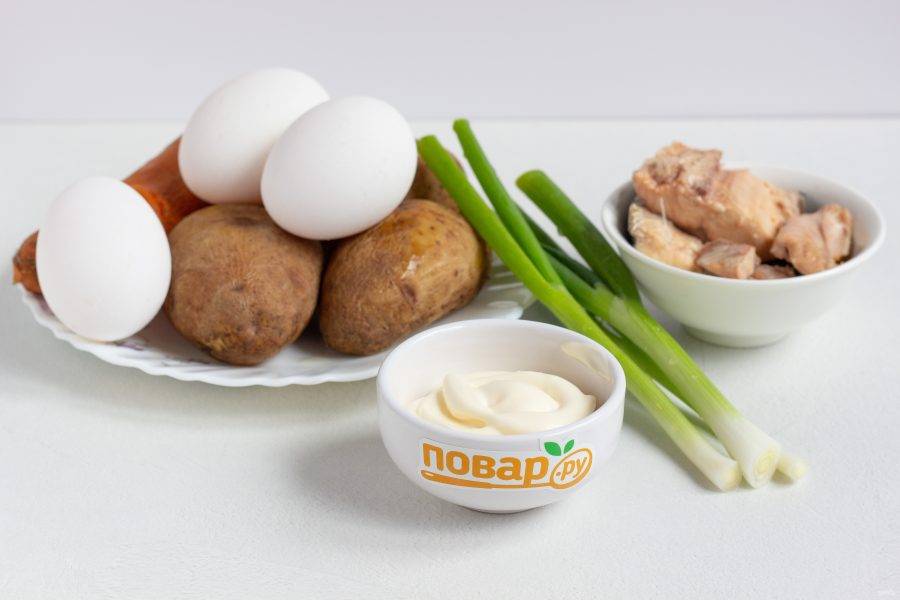 Подготовьте все необходимые ингредиенты. Картофель, морковь и яйца заранее отварите в подсоленной воде, остудите и очистите.