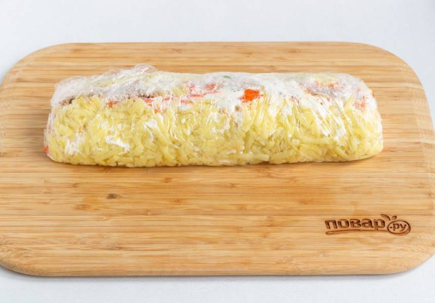 Теперь аккуратно с помощью пленки подтяните салат вверх к середине с одной и с другой стороны, кончики также прикройте пищевой пленкой и уберите в холодильник на несколько часов. Затем с помощью острого ножа разделите на порции и подавайте к столу на листьях салата.