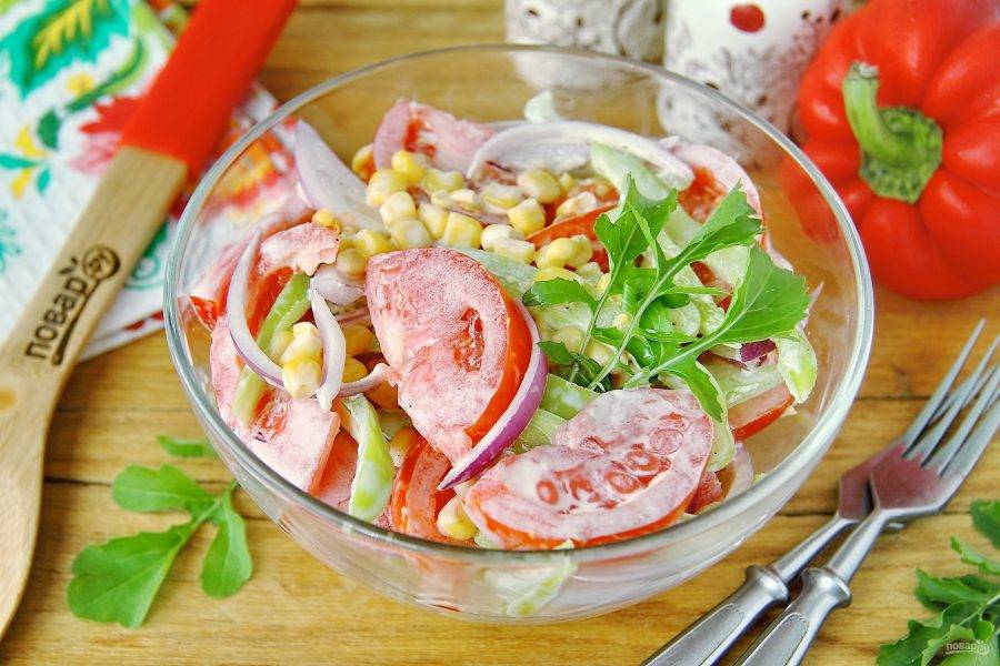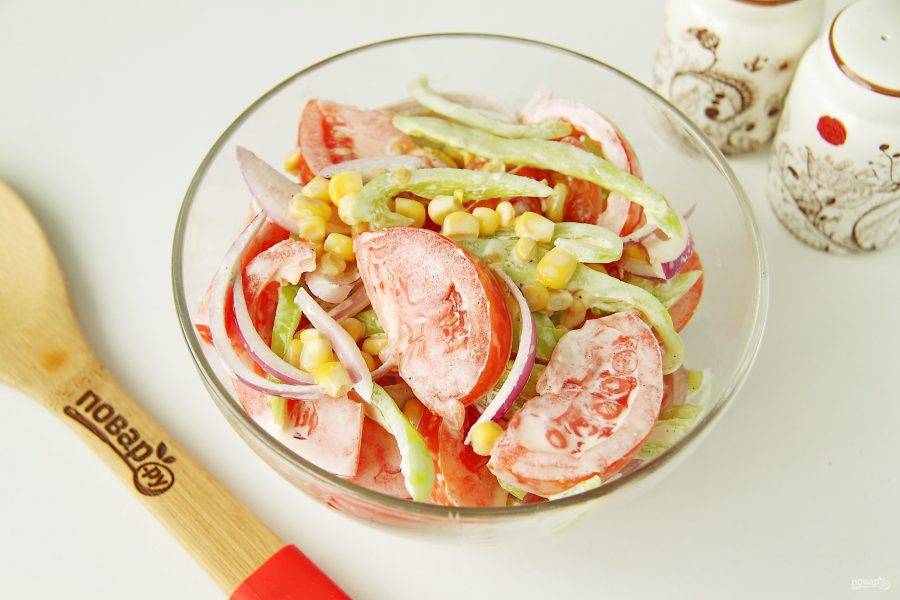 Заправьте салат майонезом, добавьте соль по вкусу, перец. Все перемешайте.