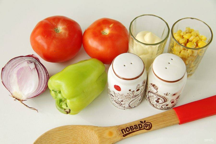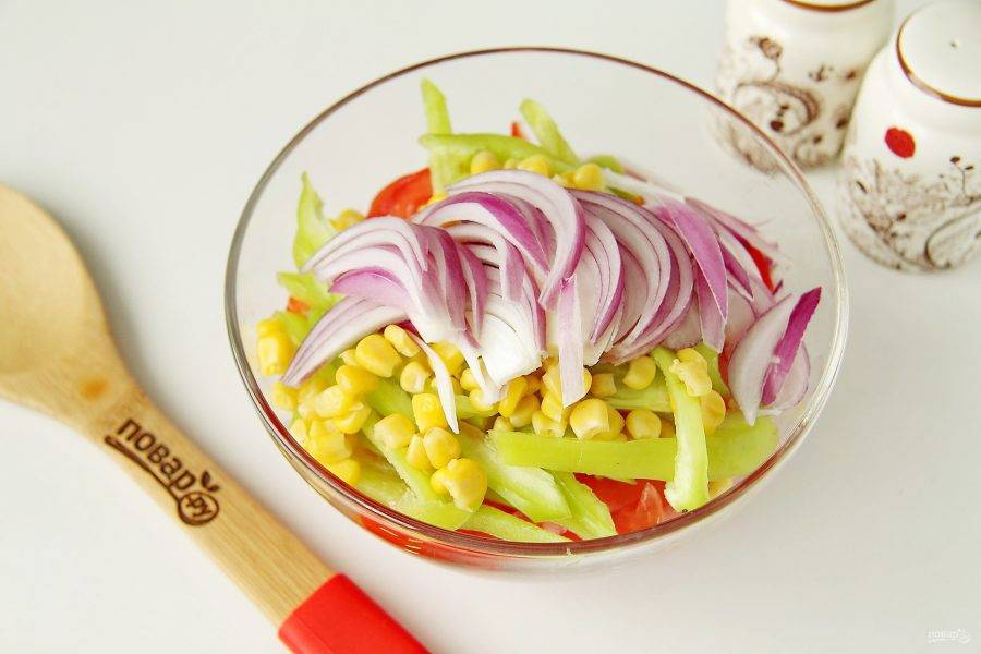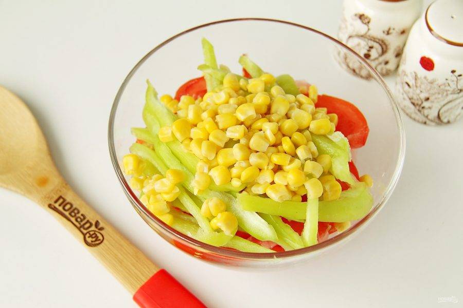 Добавьте к овощам кукурузу, с которой предварительно необходимо слить всю жидкость.