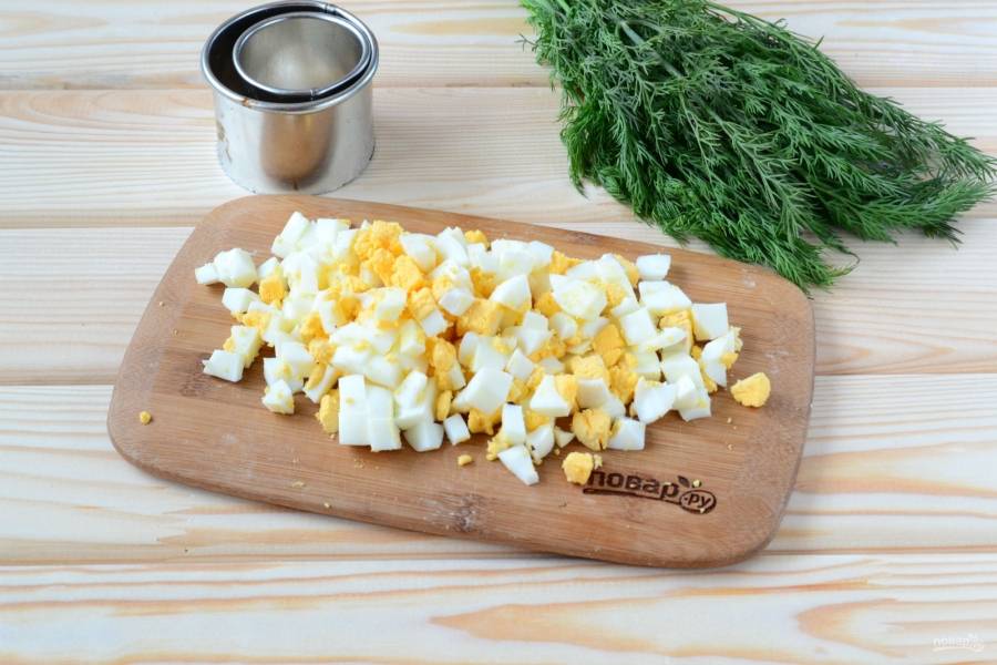 Яйца нарежьте кубиком. Размер кубика выбирайте сами, я не люблю сильно мельчить, поэтому режу средним кубиком.