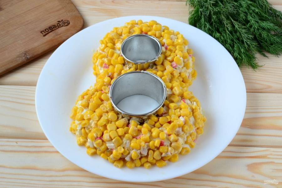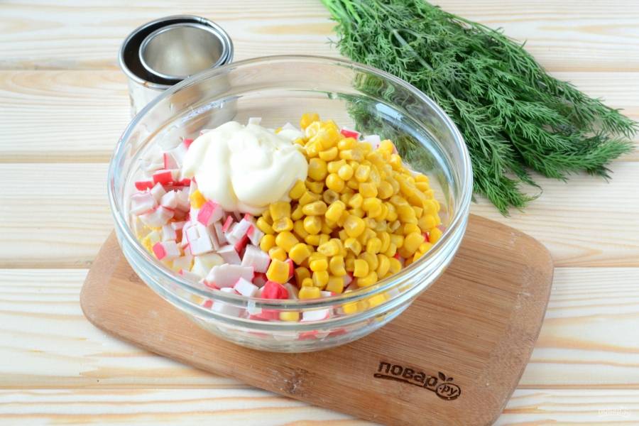 Смешайте в одной миске яйца, крабовые палочки и половину консервированной кукурузы, из которой предварительно слейте сок. Заправьте все майонезом и перемешайте.