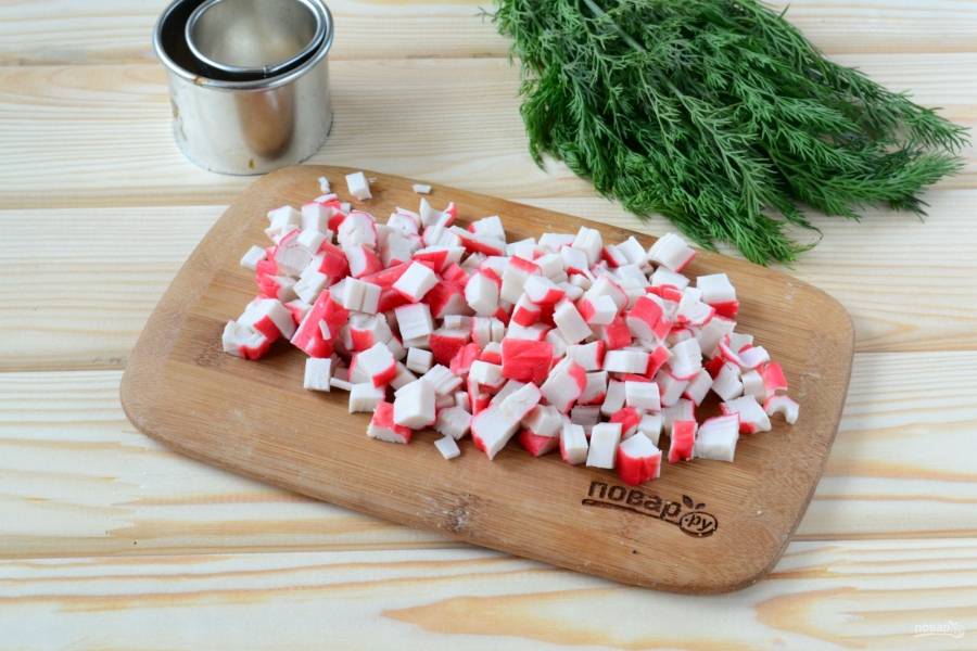 Таким же кубиком, как вы резали яйца, нарежьте и крабовые палочки.
