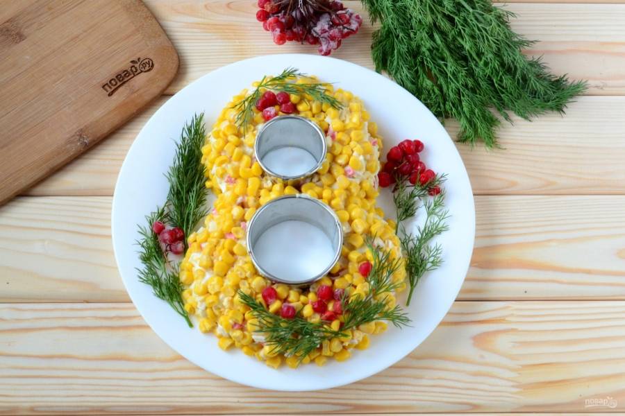 На большую плоскую тарелку поставьте два сервировочных кольца, чтобы получилась восьмерка. Вокруг сервировочных колец выложите салат, придайте ему формы восьмерки.
