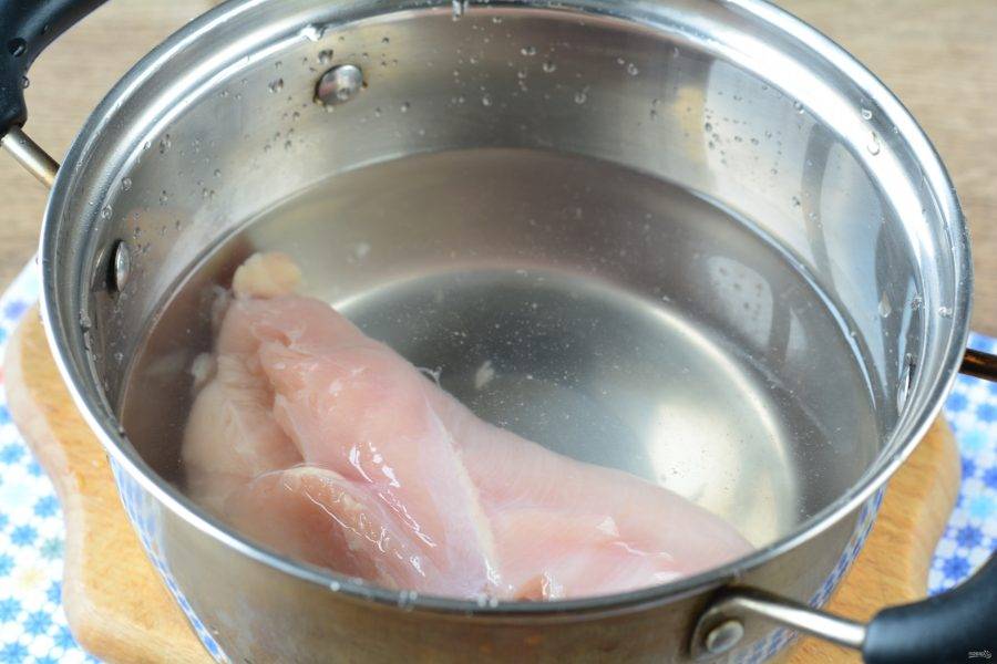 Заранее отварите куриное филе в слегка подсоленной воде. Остудите.