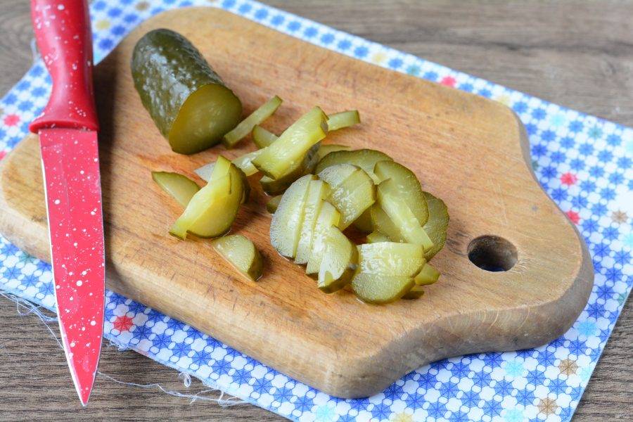 Маринованные огурцы нарежьте полосками небольшого размера. Такие огурцы придадут блюду приятную кислинку.