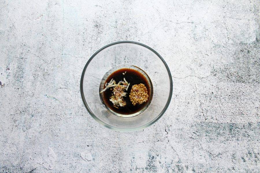 В миску влейте соевый соус, уксус, растительное масло, добавьте горчицу и измельченный чеснок, перемешайте до однородности. Салат разложите по тарелкам, заправьте заправкой и подавайте.