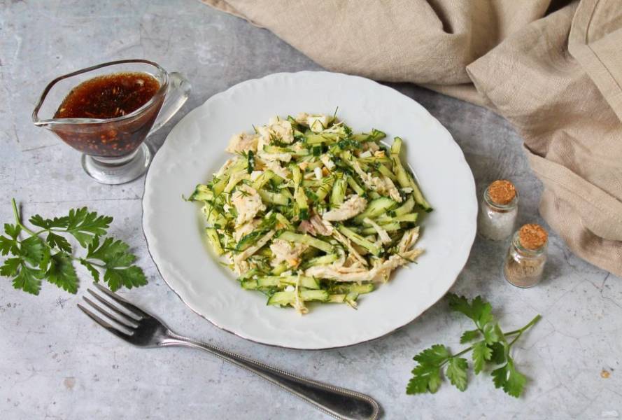 Огурец порежьте тонкой соломкой и добавьте к курице.