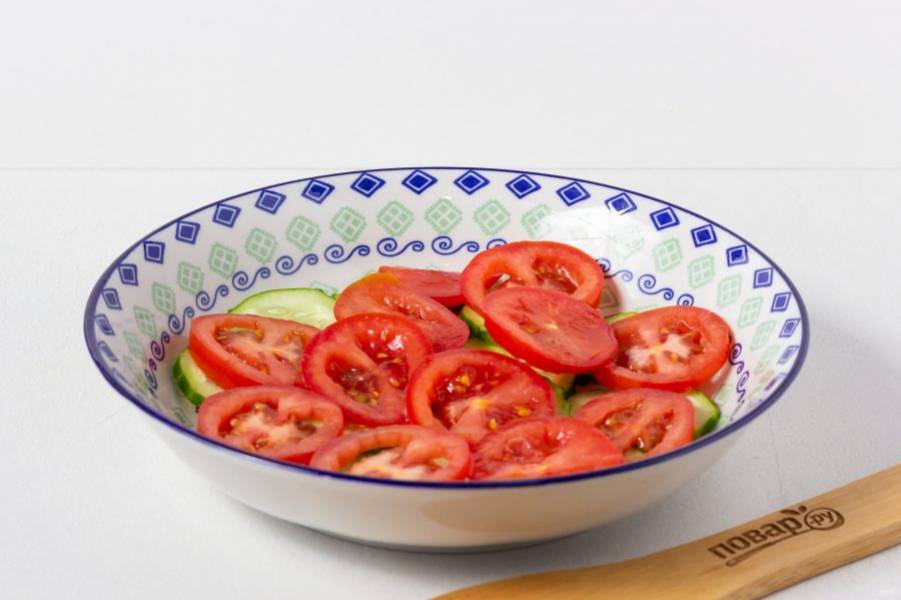 Второй – слой помидоров, нарезанных кружочками или полукругом. И повторяем слои ещё 1-2 раза.