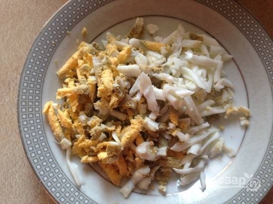 Отваренные яйца очистим и натрем на крупной терке.