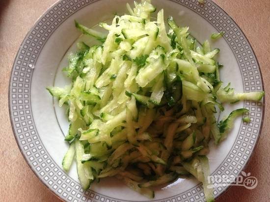 Натираем на крупной терке свежие огурцы. Выжимаем из них сок.