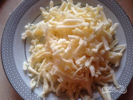 Натираем сыр на крупной терке, а небольшой кусочек для украшения салата натрем на мелкой терке.