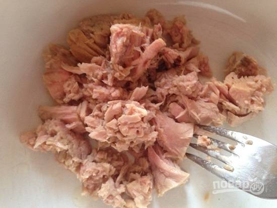 Отцеживаем сок из консервированного тунца. Можно взять любую другую консервированную рыбу. И покрошим рыбу на более мелкие кусочки.