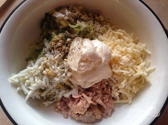 Добавляем к подготовленным компонентам салата майонез, соль и перец по вкусу. Перемешиваем.