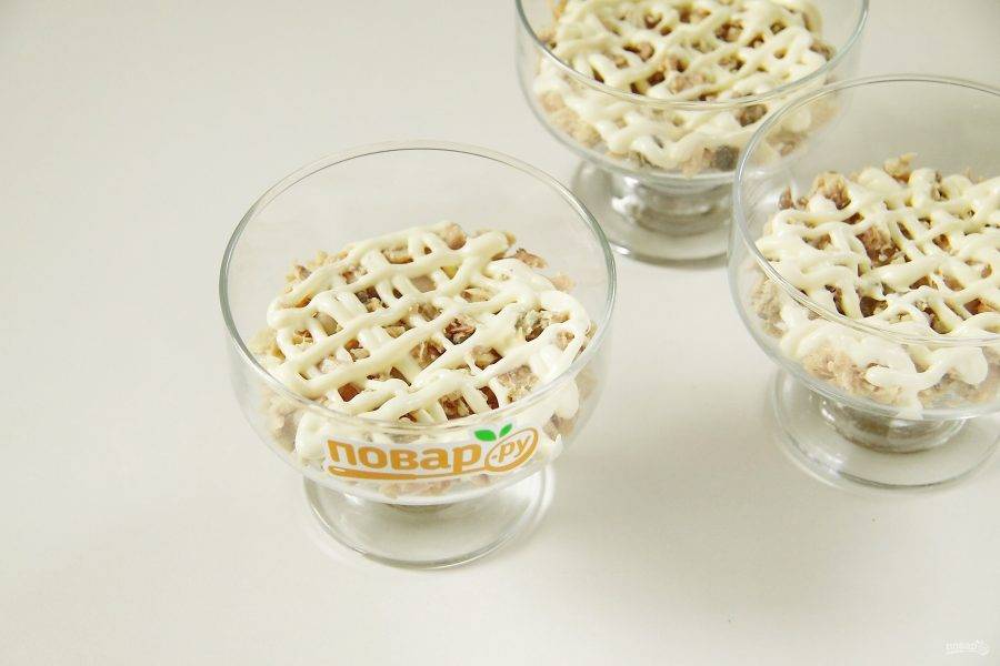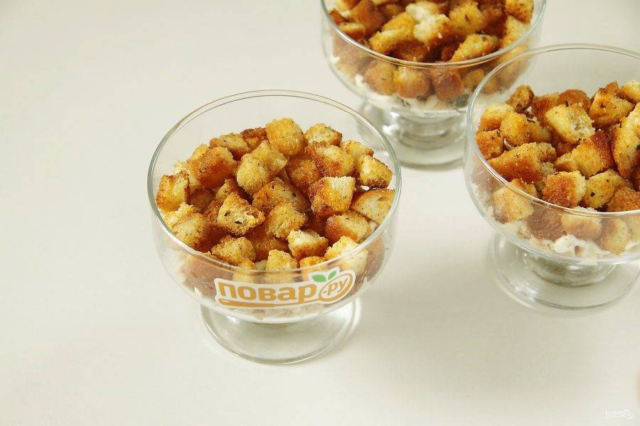 Сверху равномерно распределите сухарики. Смажьте слой майонезом.