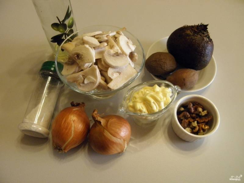 Подготовьте продукты для салата. Отварите в мундире картофель и свеклу. Очистите лук, порежьте тонко грибы.