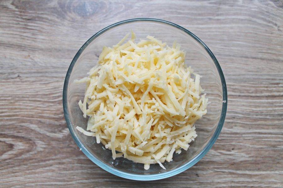 Твердый сыр натрите на крупной терке и добавьте в миску с салатом.