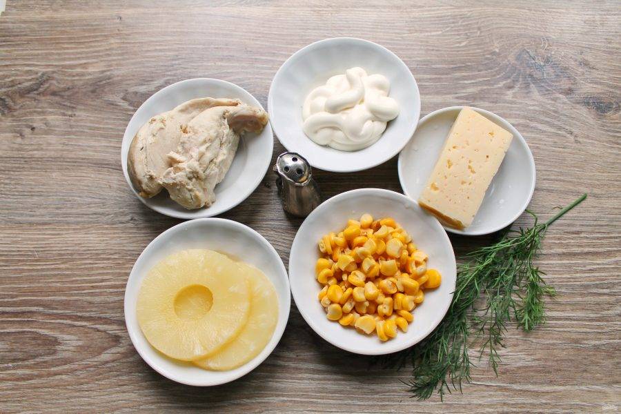 Подготовьте все необходимые ингредиенты для приготовления салата "Ананасовый рай".