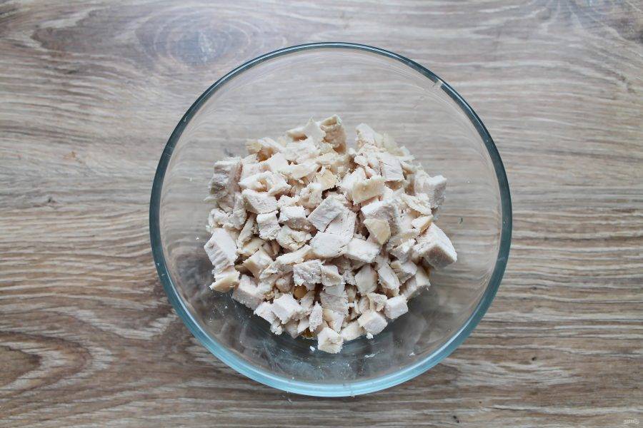 Отварную куриную грудку порежьте средним кубиком и добавьте в миску с кукурузой.