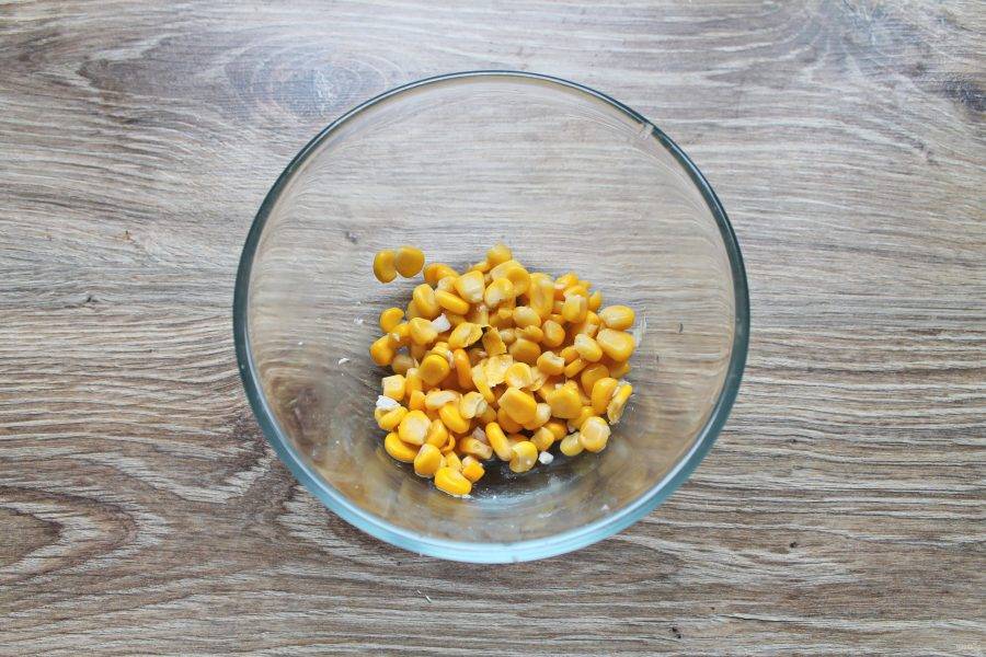 С консервированной кукурузы слейте жидкость, выложите ее в миску.
