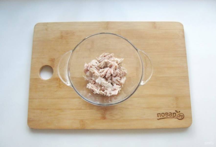 Соберите салат. В салатник, миску или на тарелку выложите слой нарезанной отварной курицы.