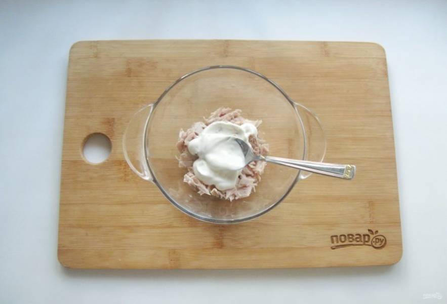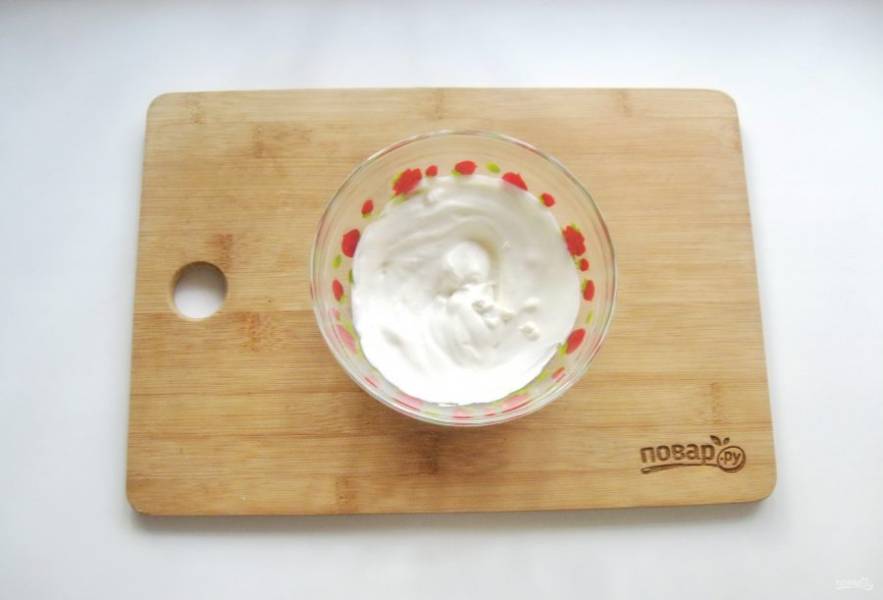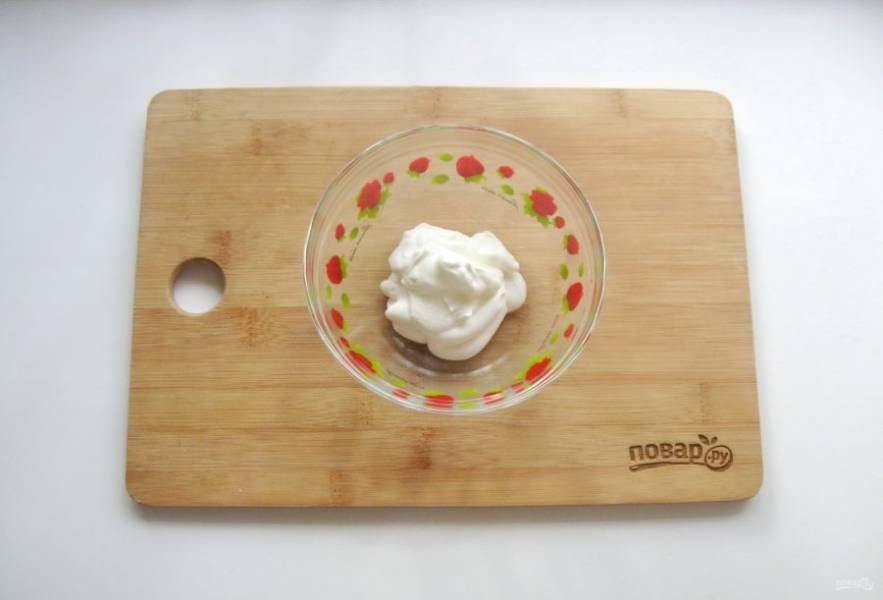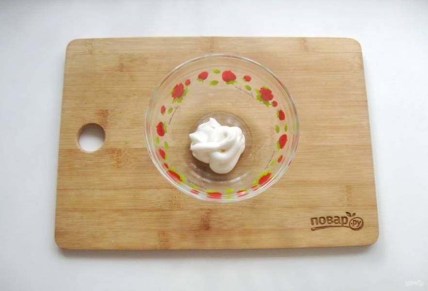 Сделайте заправку для салата. В мисочку выложите майонез.