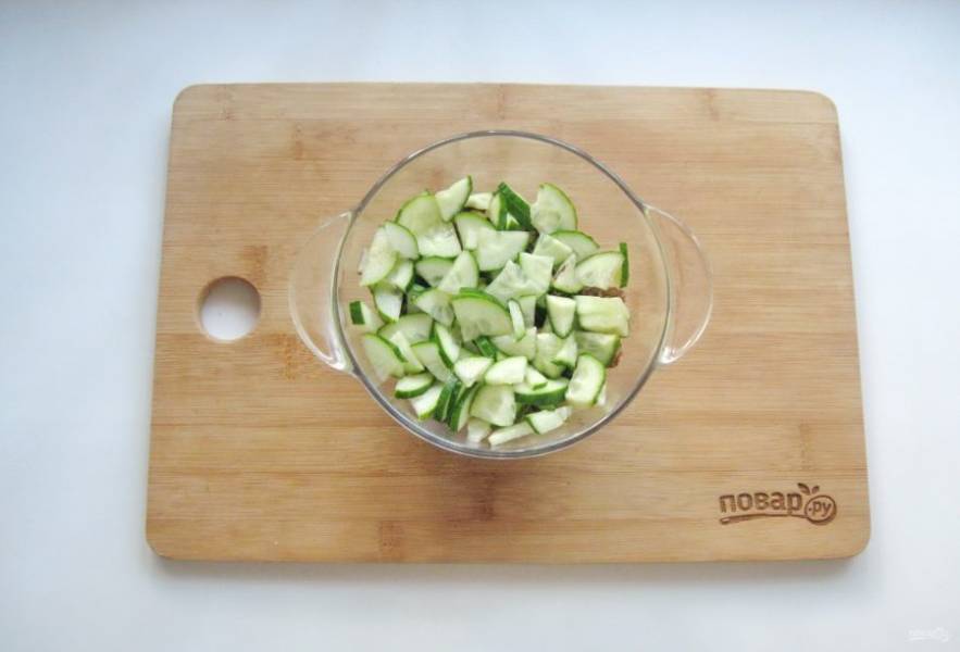 Огурцы нарежьте произвольно, но не очень крупно. Выложите на слой орехов.