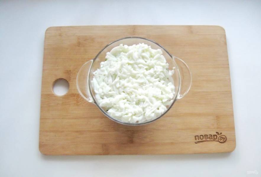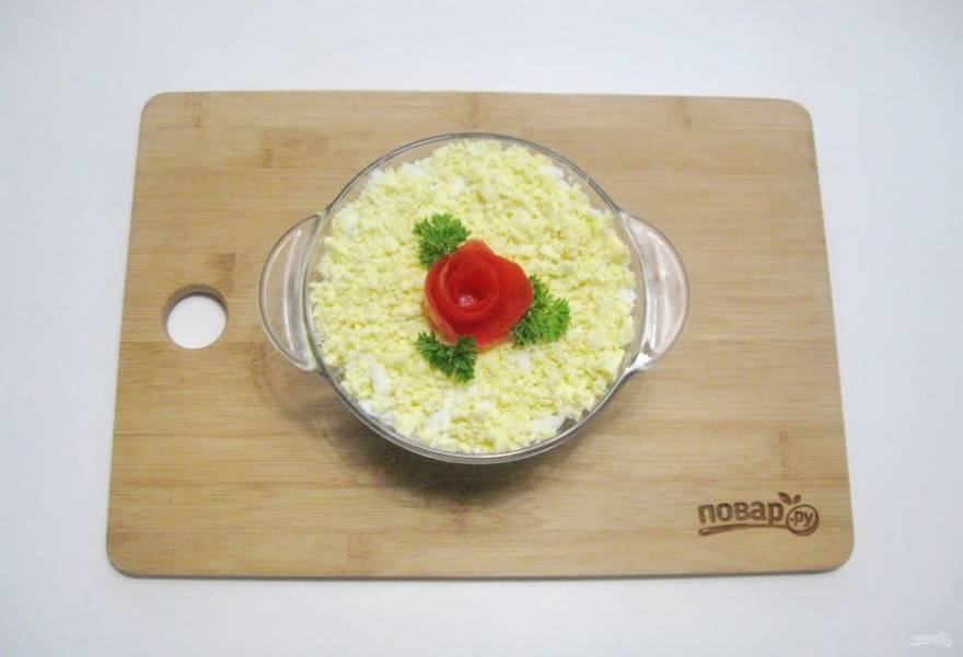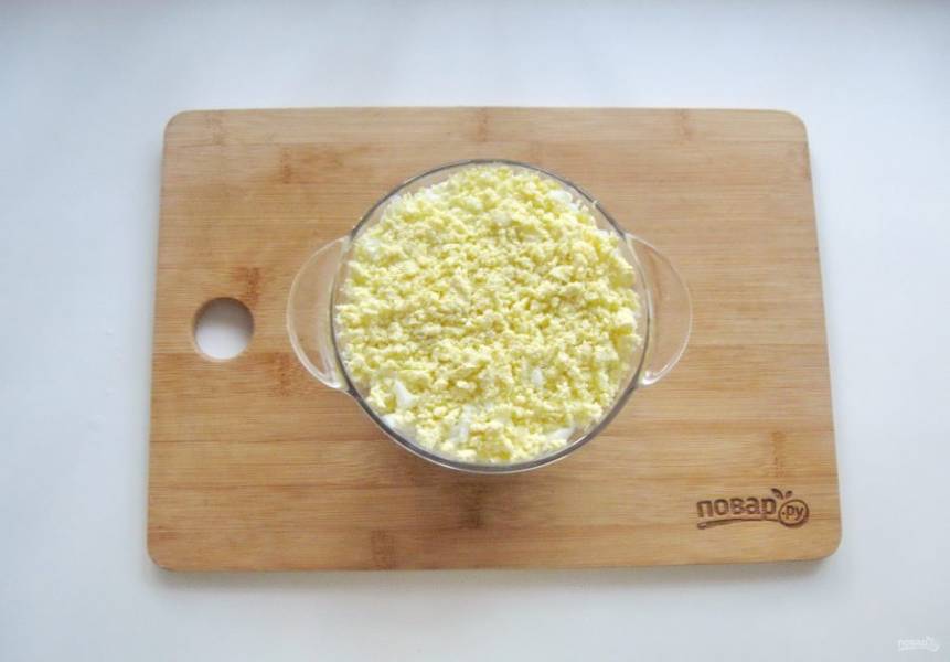 Яйца сварите вкрутую, охладите и очистите. Отделите белки от желтков. Белки натрите на терке и выложите на слой лука.