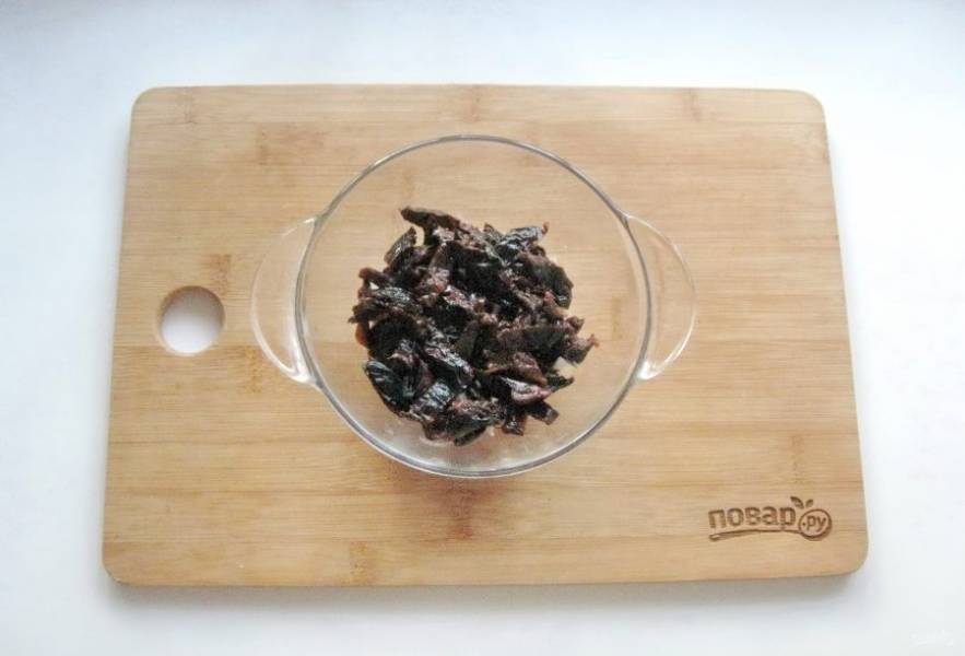 Чернослив хорошо помойте и залейте горячей водой на 5-6 минут. Затем нарежьте и выложите вторым слоем салата. Смажьте заправкой.