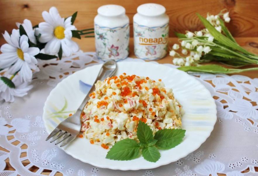 Предлагаю рецепт салата для любителей крабовых палочек. Нежный, сытный и вкусный. Яйца придают блюду бархатистость, жареный лук с морковью - небольшую сладость, а сыр - пикантность.