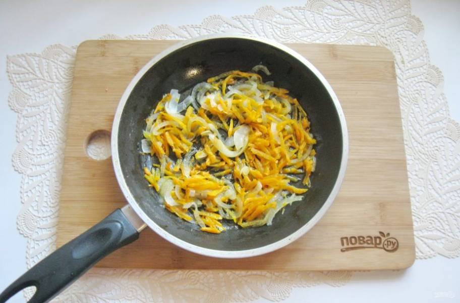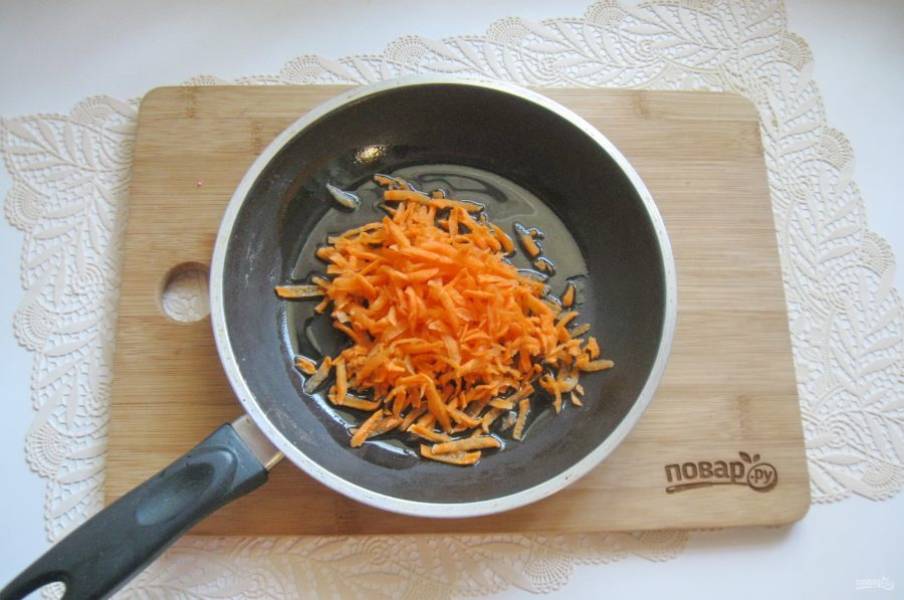 Морковь очистите, помойте и натрите на терке. Выложите в сковороду.