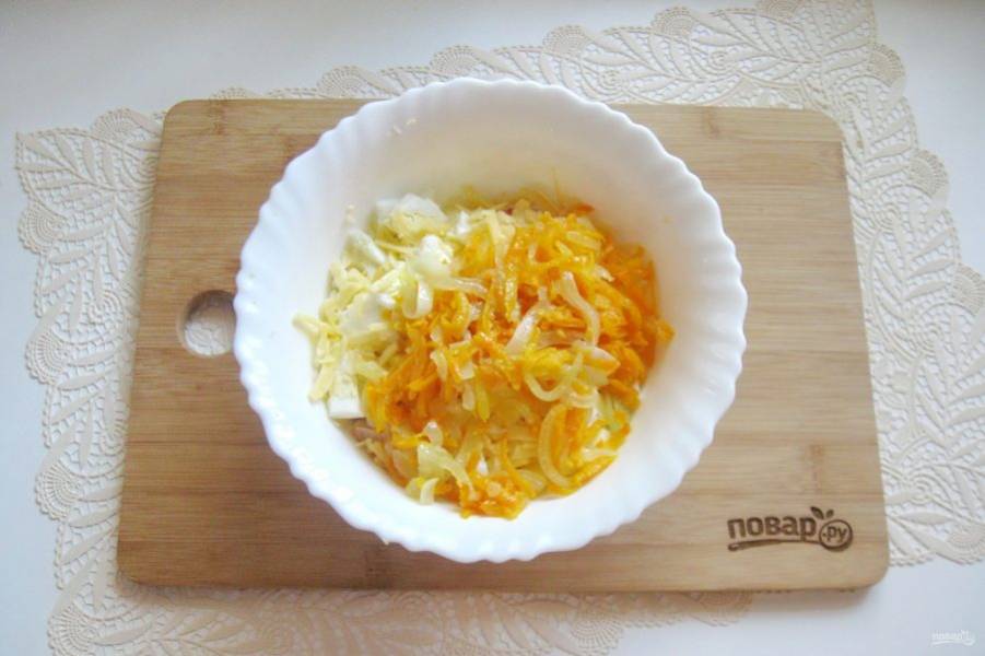 Твердый сыр натрите на терке. Выложите в салатник, добавьте лук с морковью.