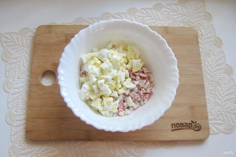 Яйца сварите вкрутую, охладите, очистите и тоже мелко нарежьте. Добавьте в салат.