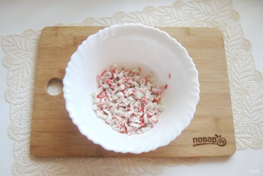 Крабовые палочки или крабовое мясо мелко нарежьте и выложите в салатник.