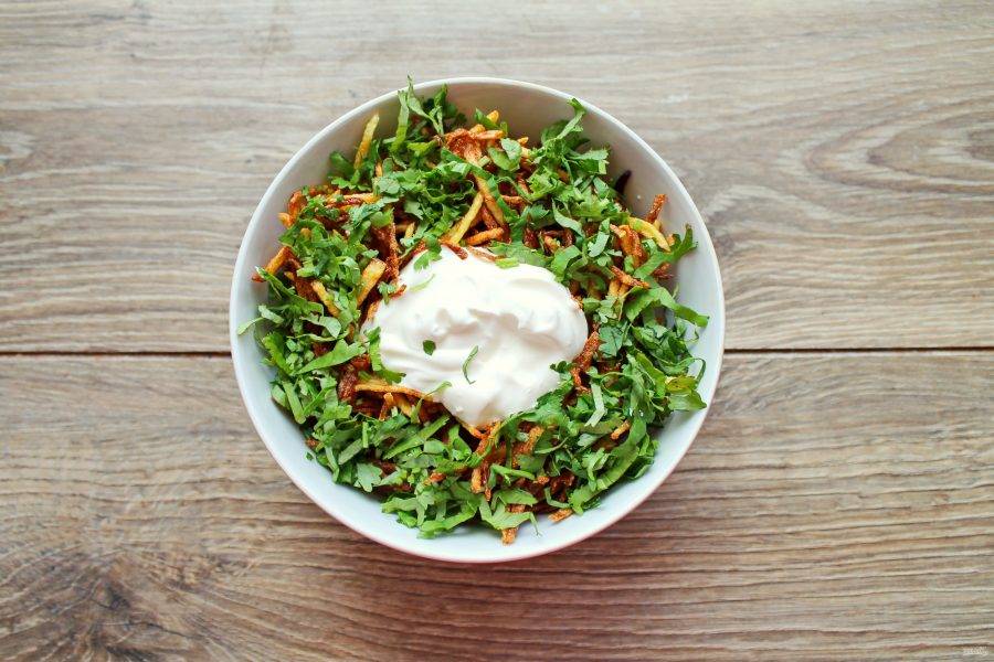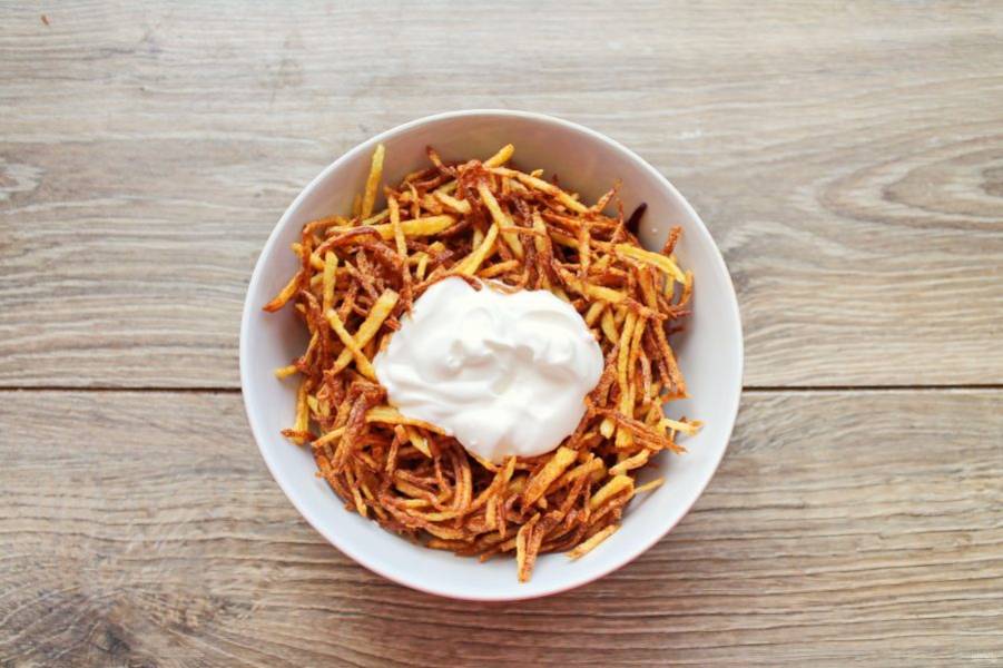 Картофель натрите на терке для корейской моркови или тонкой соломкой. Обжарьте картофель в горячем масле до золотистого цвета, выложите на бумажное полотенце и остудите.
