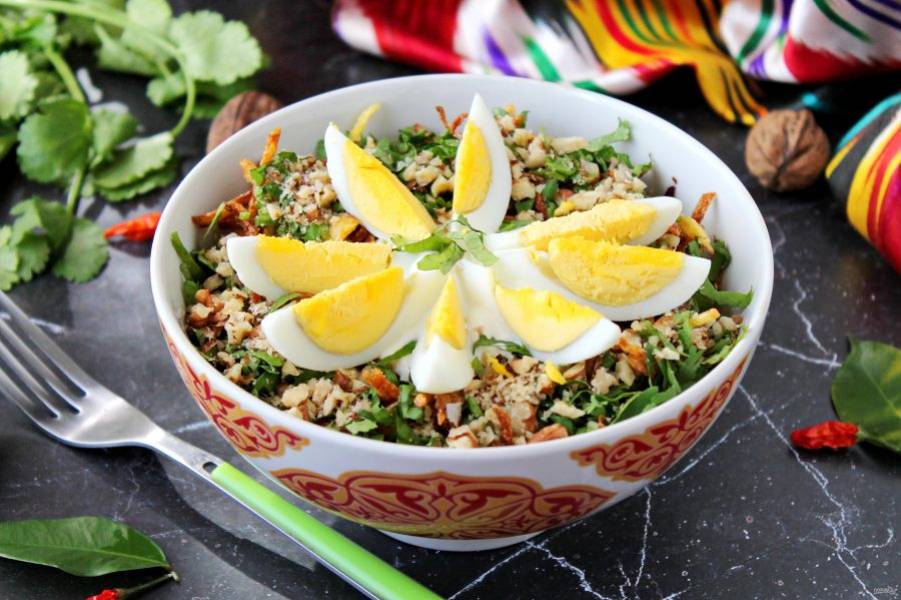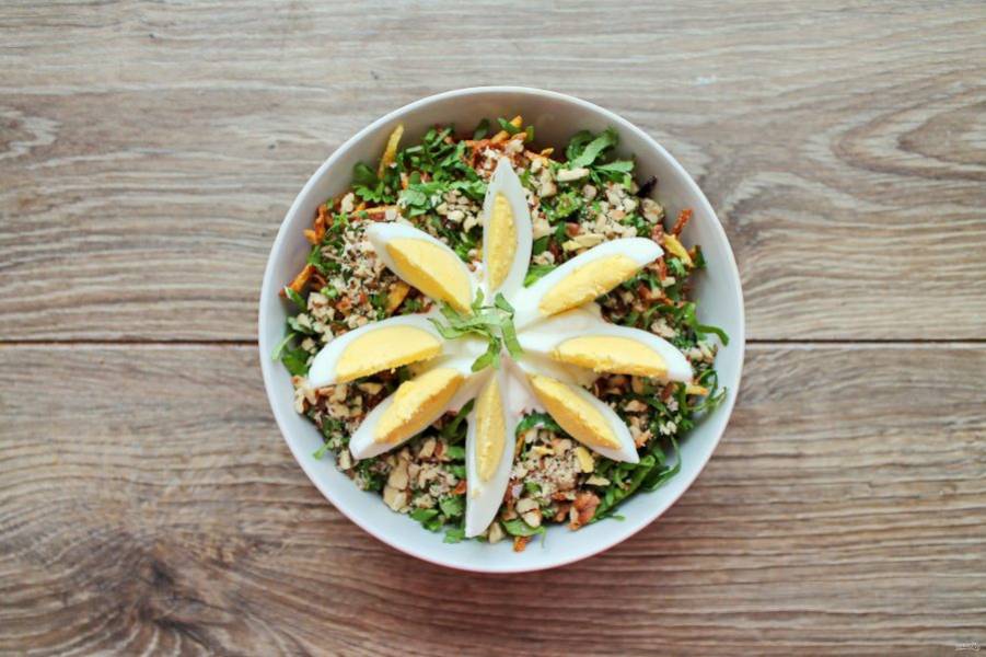 Орехи порубите и посыпьте салат. Яйцо разрежьте на сегменты, выложите сверху и сразу подавайте салат к столу.