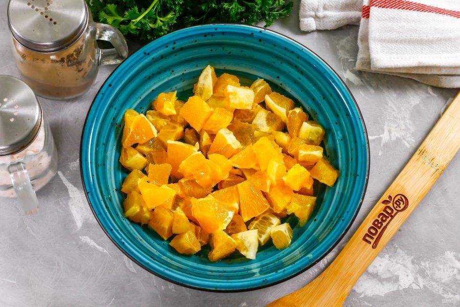 Апельсин очистите от кожуры и белых волокон, нарежьте средними кубиками и подождите 5 минут, чтобы максимально выделился сок из нарезки. Слейте его, а саму нарезку поместите в салатник.