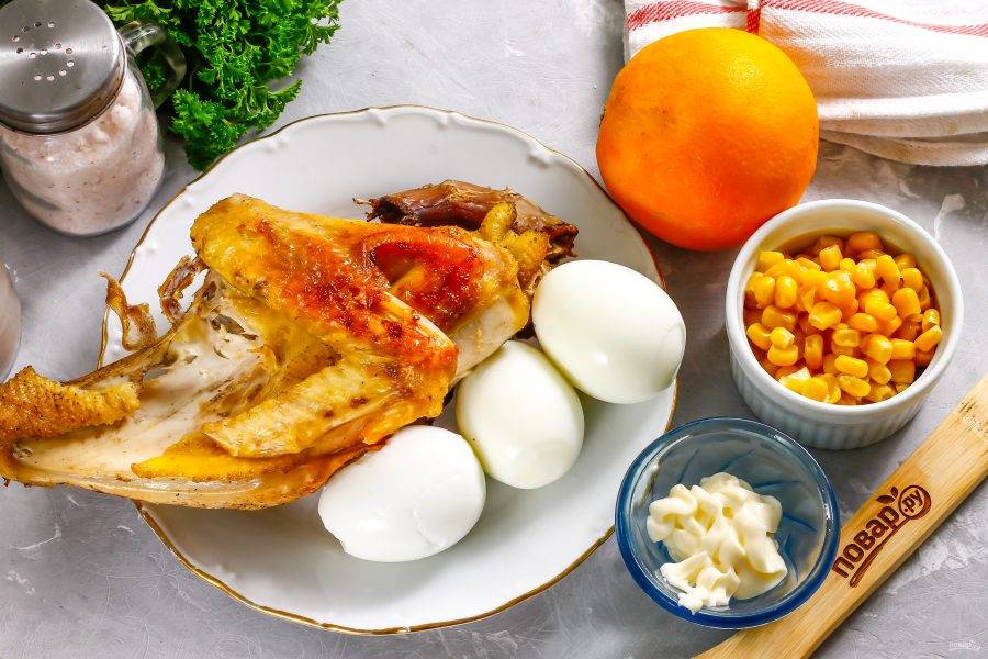 Подготовьте указанные ингредиенты. Куриное мясо заранее отварите или запеките до готовности и остудите. Также отварите и остудите куриные яйца.