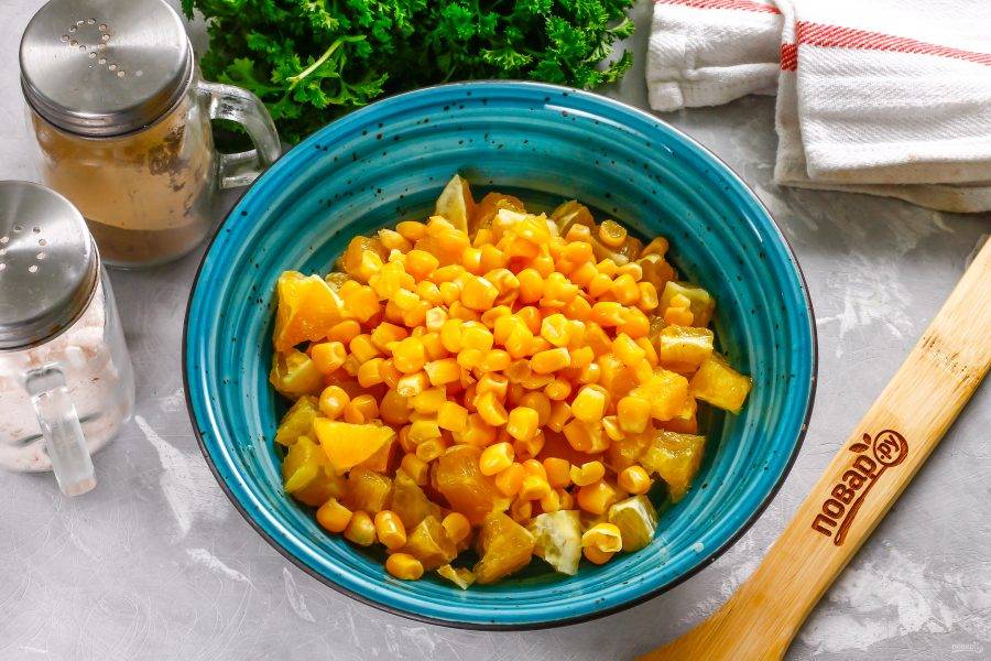 Вскройте банку с консервированной кукурузой, слейте маринад. Половину содержимого банки выложите в емкость.