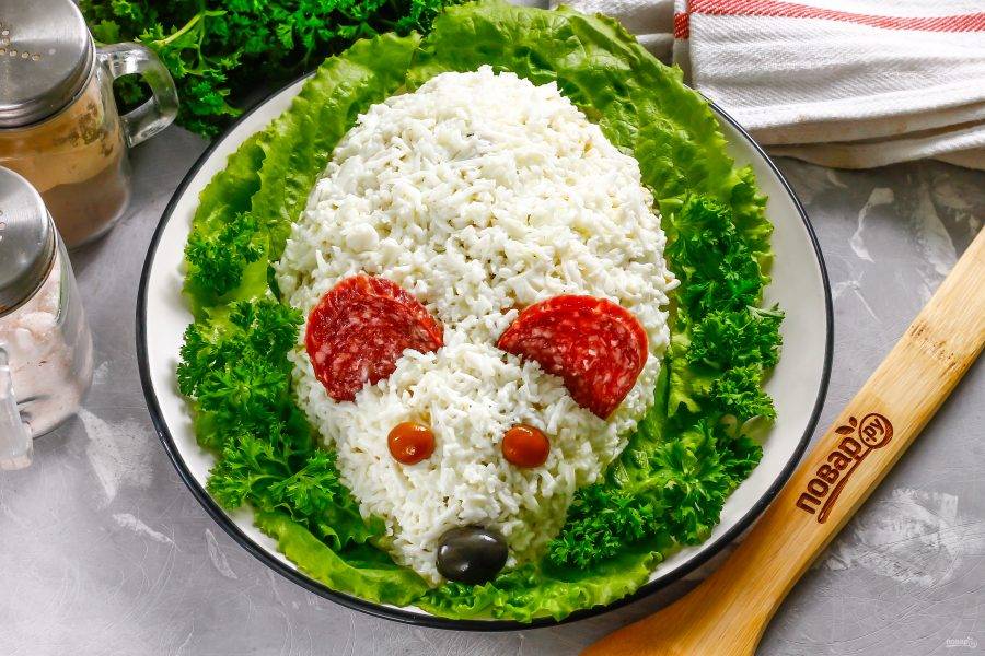 Выложите салат на тарелку в форме капли. Острый край будет носиком мышки.