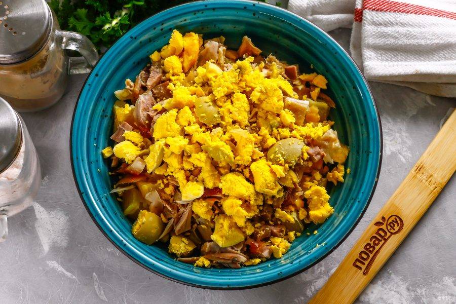 Куриное мясо нарежьте такими же кубиками, как и апельсин, выложите в салатник. Туда же раскрошите отварные куриные желтки, белки отложите для покрытия салата.