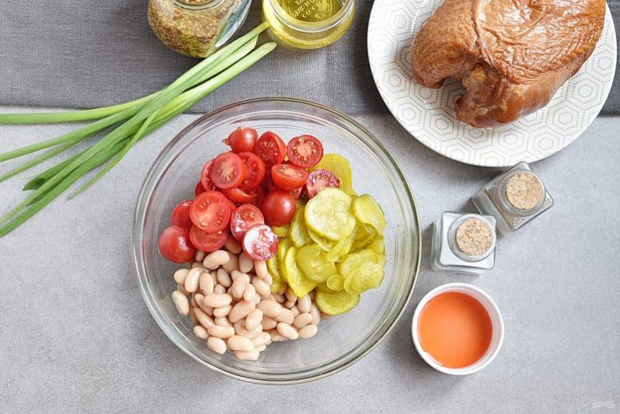 Фасоль обсушите и выложите в глубокую миску. Добавьте огурчики и половинки черри.